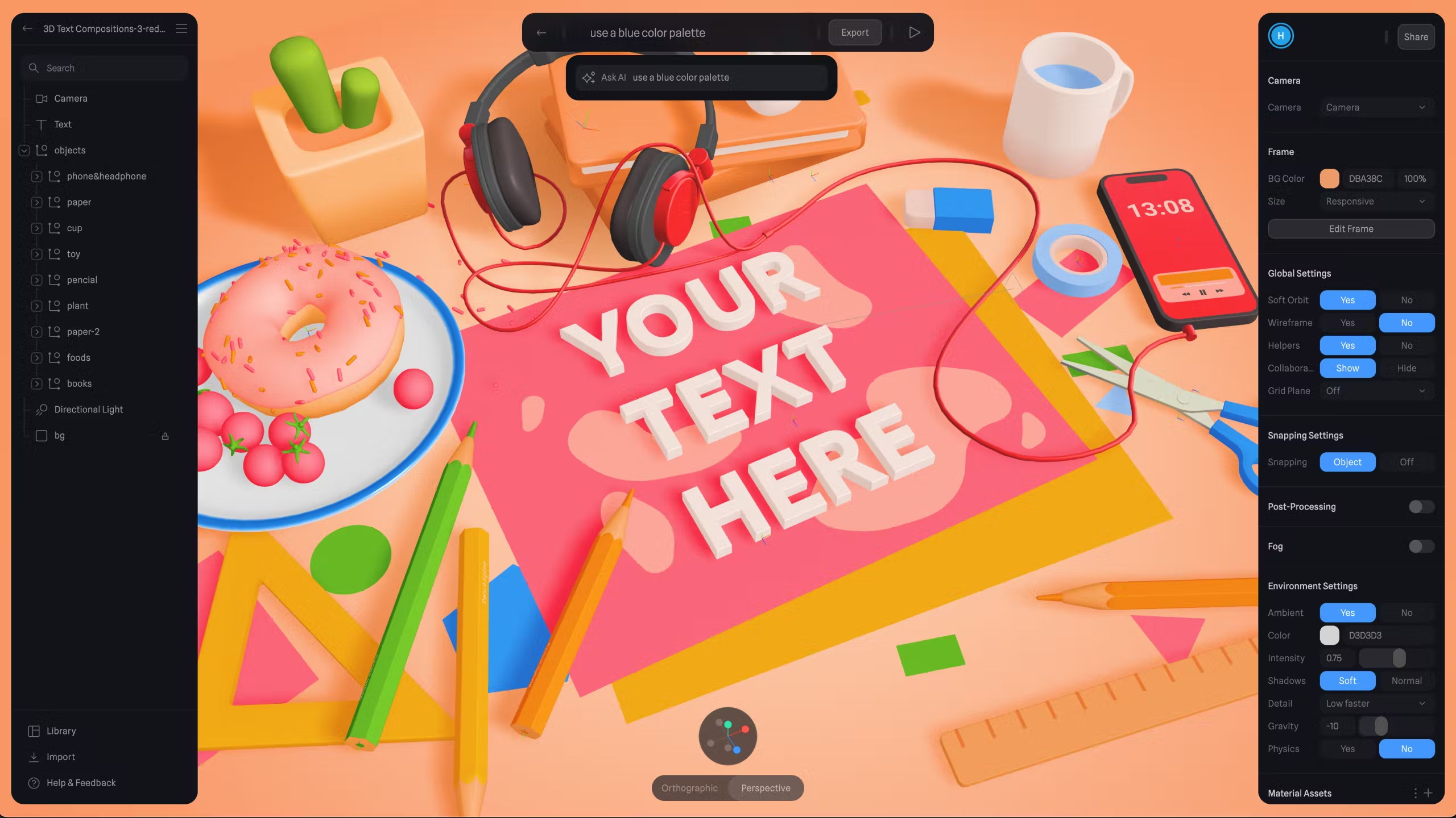 Spline AI is a new way to design and collaborate in 3d while using AI. 🔮Create objects/scenes, 📸 animate, 🏓 add physics, 🕹️brainstorm ideas, 🎨change colors/materials, 🌈generate style alternatives, and more.